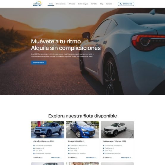 Via Rent es una plantilla premium diseñada para negocios de alquiler de vehículos que buscan una solución moderna, automatizada y fácil de gestionar, pero con un enfoque más directo: la reserva se confirma por WhatsApp.